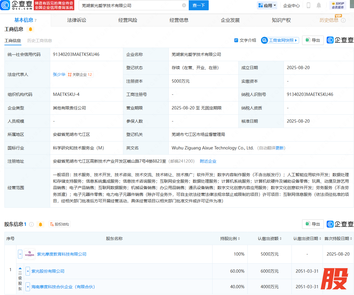 近日,芜湖紫光爱学技术有限公司成立,法定代表人为张少华,注册资本为5000万元,经营范围包含:人工智能应用软件开发;数据处理和存储支持服务;信息系统集成服务;互联网安全服务等。企查查股权穿透显示,该公司由紫光股份(000938)旗下紫光摩度教育科技有限公司全资持股。