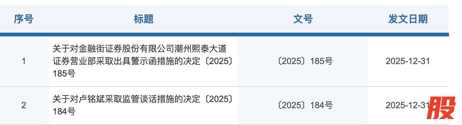 2025年12月31日,内蒙古证监局与广东证监局同步披露了对金融街证券的监管动作。在内蒙古地区,马甜、鲁文龙、王鑫、王丽虹、郝丽珍、康诚等6名分布在包头、牙克石、呼和浩特的员工被采取警示函措施;在广东地区,卢铭斌则被采取监管谈话措施。这种大面积、跨区域的人员违规,直接反映出公司对分支机构及从业人员管控有效性不足。